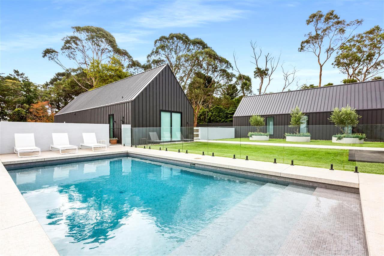 Sitting on around ten acres, where Western Port Bay meets the countryside, is this striking pavilion style home. Langhaus is enveloped in black, with white and timber accents, fusing Scandinavian architecture and modern design elements, the epitome of uncomplicated and superb coastal living. Multiple sliding doors lead to the terrace and outdoor living area. The covered outdoor area and the glamorous pool provides the perfect place to unwind. A fireplace, dining table and lounge encourage lazy days no matter the weather. Embrace the sun and watch the ocean sparkle from the terrace, while the vast lush lawns are ideal for an evening of star gazing. || Minimum 4 hour bookings at $1000/hr - message for more information ||