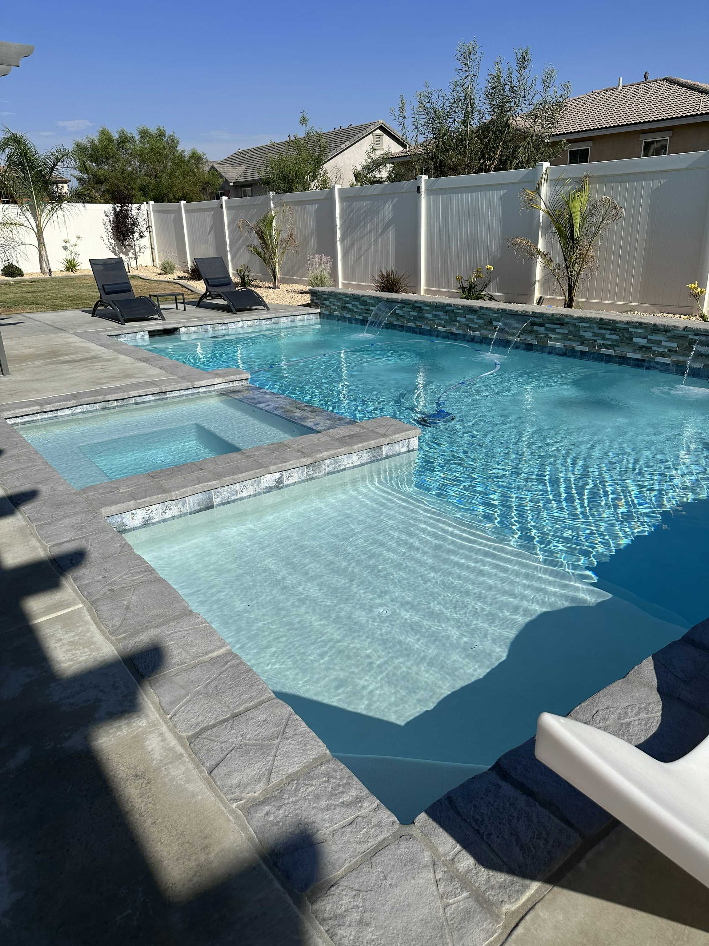Relax and escape the heat in this resort style oasis located in new Moreno Valley. Enjoy the tranquility of the waterfalls as you float across the water. Layout on the tanning shelf as you enjoy the cool water while still enjoying the sun. The tanning shelf can also be used as a kiddie play area. Take a dip in the attached jacuzzi or enjoy the underwater lighting features from the relaxing patio as the sun sets. A perfect day at the pool starts here. Two grass areas are available for picnics, games or a bouncy house. For evening bookings, fire pit is available upon request.