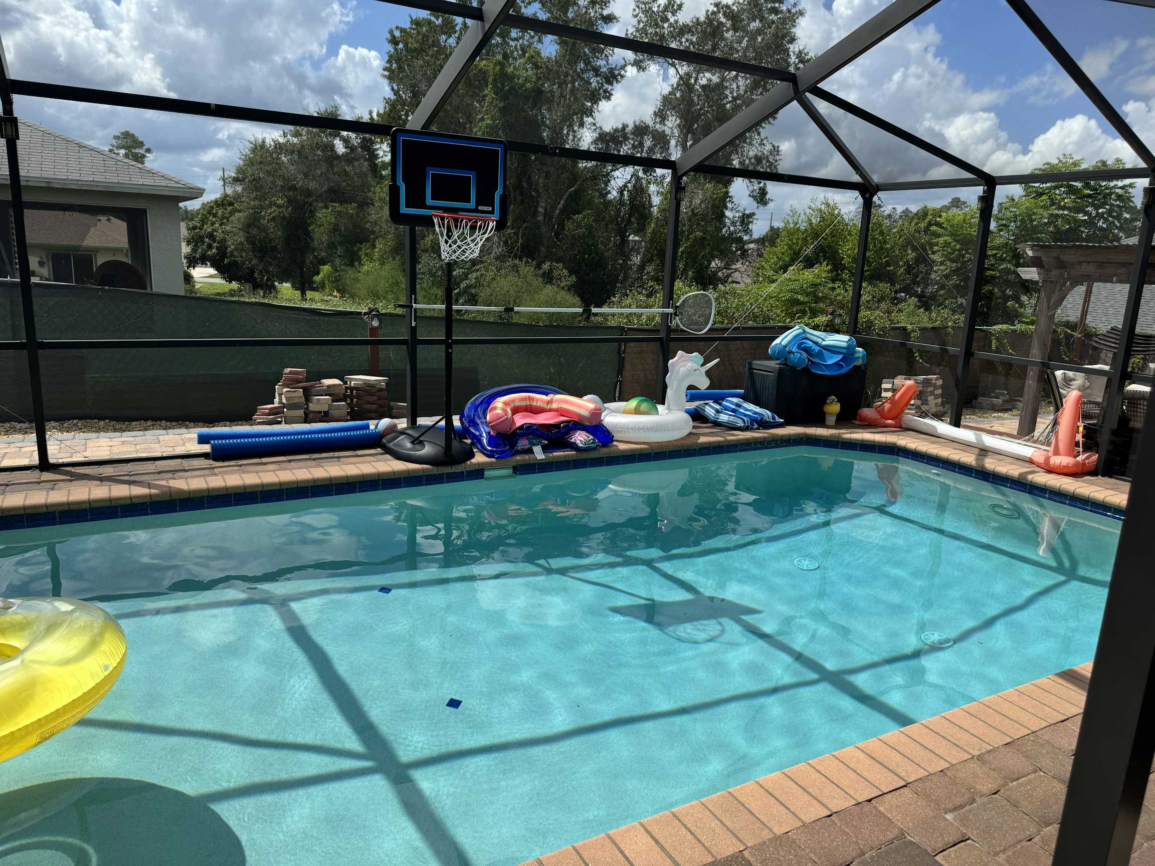 Large backyard screened in lanai with pool (3’ - 5.5’) plenty of floats, pool noodles. Basketball net on side of pool. 55” HD Samsung TV in yard. Plenty of seating area. Table that seats 6 and sectional outdoor sofa with fire table. Outside space has cushioned patio set, a 10’ basketball hoop, large bar area, Weber gas grill and Blackstone flat top available, you will have to supply your own propane, or an additional fee for usage of propane. Folding tables and chairs also available for a feee